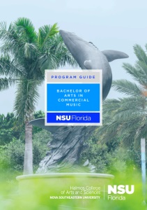 PAGE 3 Welcome to the Bachelor of Arts in Commercial Music Program at Nova Southeastern University! This program will help you develop your skills as a professional musician, and develop an entrepreneurial spirit necessary for success within the music industry. This program is located in the heart of South Florida, one of the largest commercial music centers in the United States. The program covers a broad range of musical topics, beginning with a firm foundation in musicianship, theory, and ear training, and continuing with Western and global music history, music production, music business, live performance, recording and post production, and more. The Commercial Music Program offers several student-led ensembles, including the Bossa Nova Chorale and the Mako Band, that provide an outlet for students to perform and dive into diverse performance events while gaining practical experience as performers, music businesspeople, and technicians. The vision of the Commercial Music Program at NSU is for you to not only learn and grow through these experiences, but also for you to develop your creativity, competitive edge, entrepreneurial mindset, and technological savvy to be successful in the music industry. Bill J. Adams, D.M.A. Commercial Music Program Director INTRODUCTION AND VISION